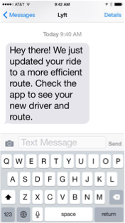 E-posta pazarlama çabalarını tamamlamak için Lyft, sürücüler ve yolcular arasında gerçek zamanlı iletişimi kolaylaştırmak için SMS kullanır. Lyft, bir sürücü yolculuk talebini kabul ettiğinde, bir yere vardığında veya sürüş durumları değiştiğinde yolculara otomatik metin mesajları gönderir.