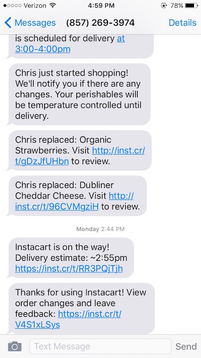 Instacart, e-posta pazarlamasını tamamlamak için sipariş onaylarını, teslimat ETA'larını, müşteri memnuniyeti anketlerini ve çalışan vardiya uyarılarını yönetmek için SMS kullanır. Şirket ayrıca , alışveriş yapanların, alışverişlerinin durumu hakkında müşteri hizmetleri temsilcilerine gerçek zamanlı olarak metin göndermelerine olanak tanıyarak SMS'in iki yönlü iletişim olanaklarından yararlanıyor.