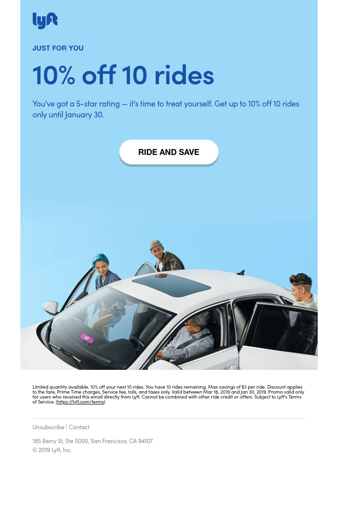 Lyft, büyüleyici görseller, tutarlı marka bilinci oluşturma ve net harekete geçirici mesajlar içeren dönüm noktası ödülleri, özel promosyonlar, iki haftalık haber bültenleri ve "Geri Kazanma" kampanyalarıyla müşterilerin ilgisini çeker. Lyft ayrıca yolculuk tamamlandığında e-posta yoluyla otomatik yolculuk makbuzları gönderir, böylece müşteriler istedikleri zaman yolculuklarının ayrıntılarına erişebilir.