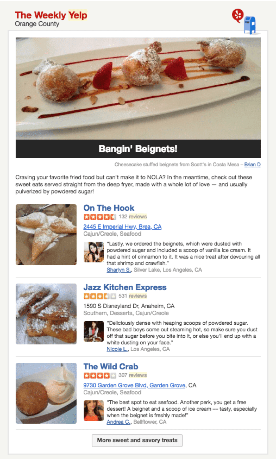 Yelp, hem işletmeler hem de tüketicilerle anlamlı bir şekilde bağlantı kurmak için e-posta pazarlamasını kullanır. Yelp, e-posta yoluyla potansiyel müşterilere yerel restoran önerileri ve özellikli incelemeler göndererek, onları renkli şablonlar ve ağız sulandıran görüntülerle buluşturuyor.