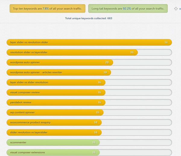 HitTail'in tek yaptığı, sitenize gelen tüm anahtar kelimelerinizi izlemek, bunları bir çubuk grafikte birbirlerine karşı istiflemek ve ardından kişisel olarak sizin için en iyi uzun kuyruk fırsatlarını belirlemektir.