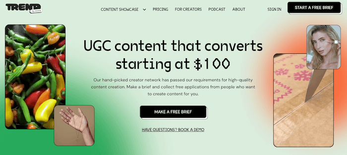 Trend, ürün çekimleri, referans videoları, kutudan çıkarma videoları ve daha fazlası gibi kullanıcı tarafından oluşturulan içerik (UGC) oluşturmak için markaların içerik oluşturucularla bağlantı kurmasına yardımcı olan bir etkileyici platform ve pazar yeridir.