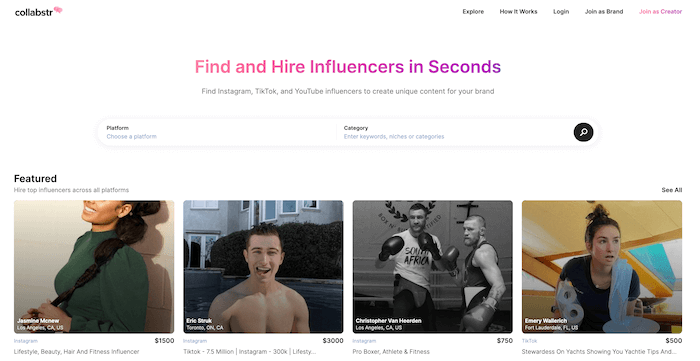 - İncelenmiş etkileyiciler: Collabstr'daki tüm etkileyiciler platform tarafından incelenir, böylece yüksek kaliteli içerik oluşturucularla çalıştığınızdan emin olabilirsiniz.