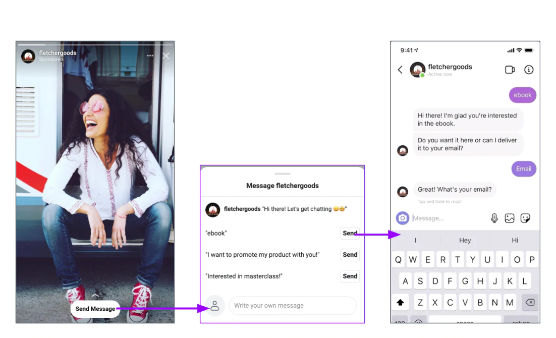 Birinin tek yapması gereken, Hikayenizden önceden belirlenmiş bir anahtar kelime girmek ve Instagram Messenger'da otomatik bir konuşma başlatacaksınız. Buradan, izleyicilerin iletişim bilgilerini toplayabilir, bir kupon kodu veya potansiyel müşteri sunabilir veya işletme hedeflerinize ulaşmanıza yardımcı olacak başka herhangi bir şey yapabilirsiniz.