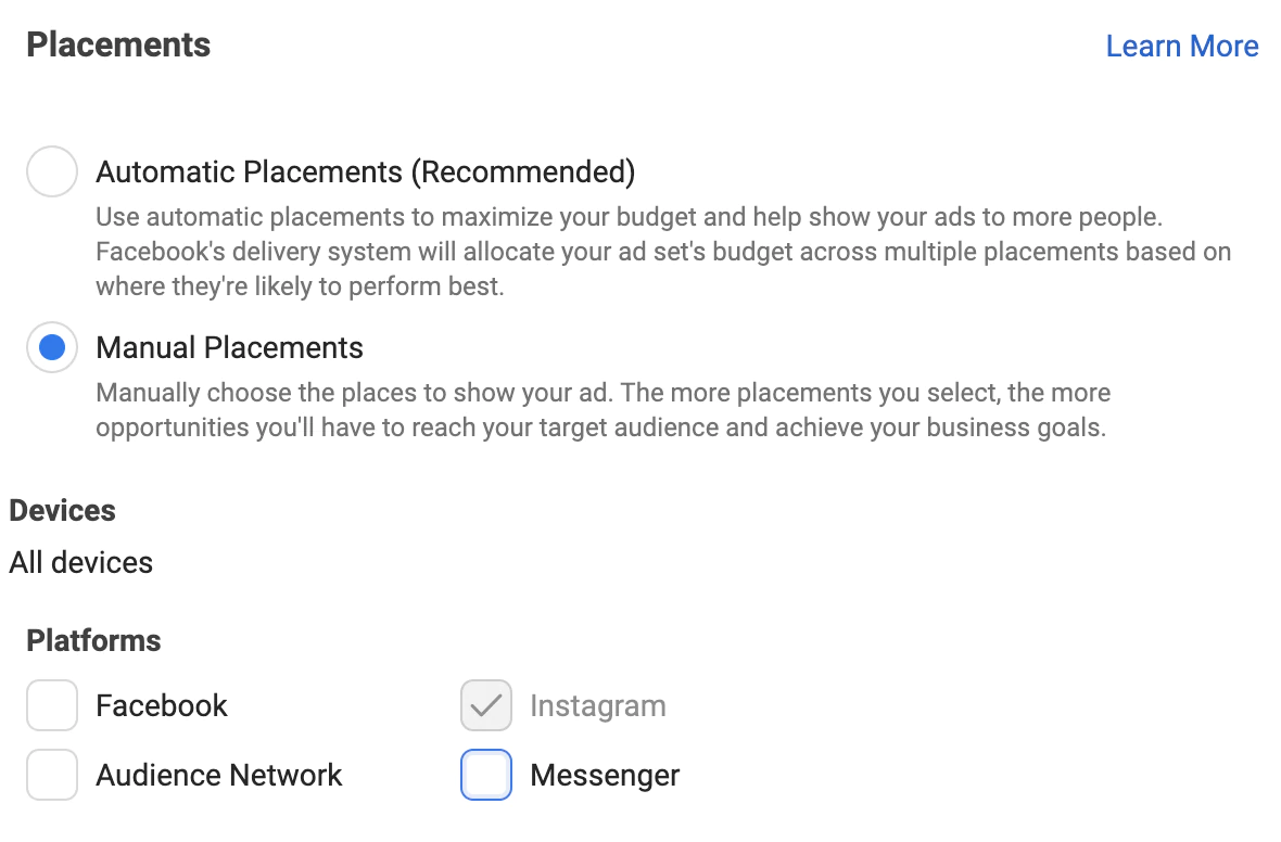 Ardından, reklam yerleşimlerinizi seçin. Kampanyanızı Facebook ve Instagram'da, ayrıca Audience Network ve Messenger'da yayınlama seçeneğini göreceksiniz. Instagram hariç her şeyin seçimini kaldırın.