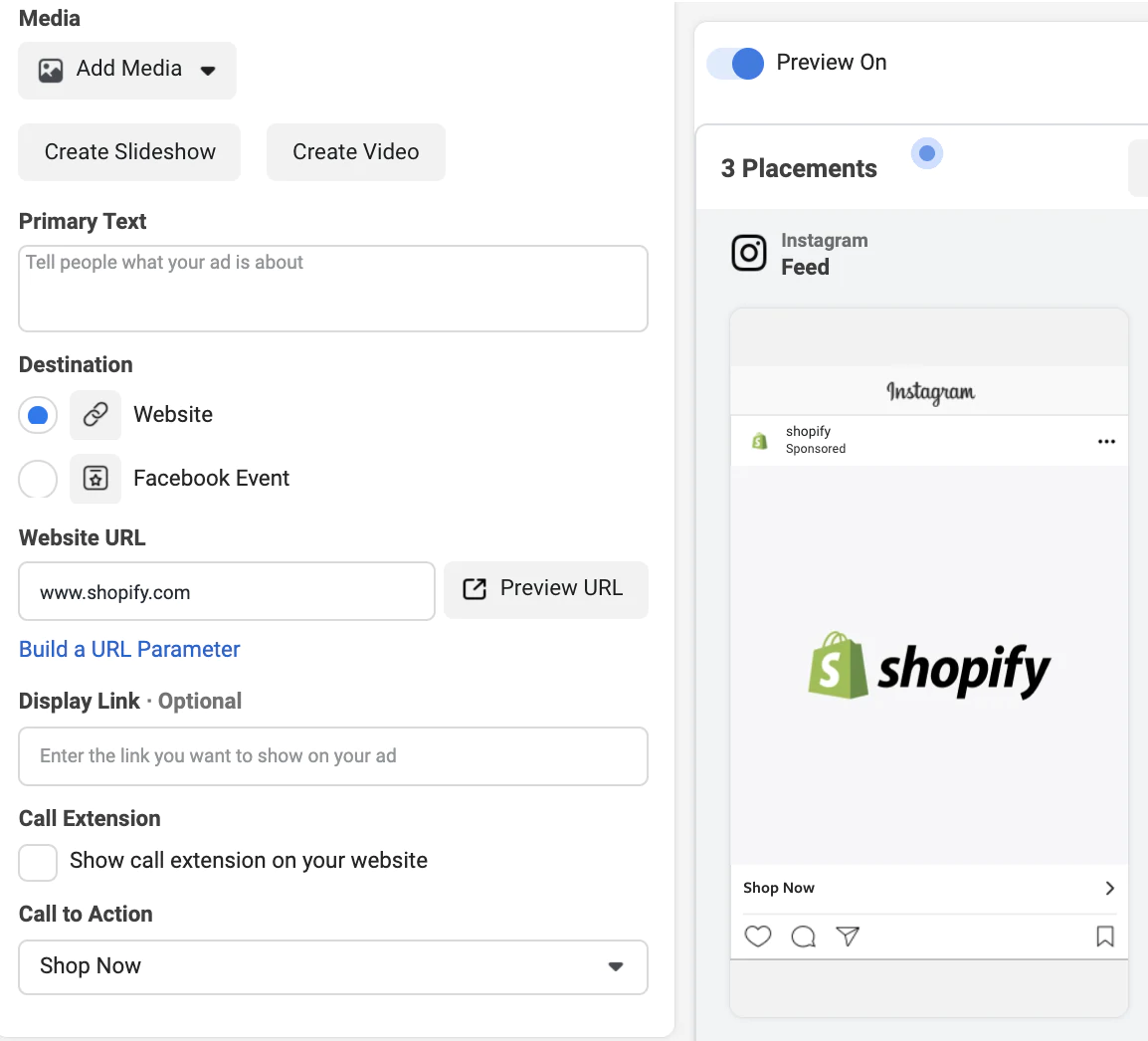 Görsellerinizi yükledikten sonra, aşağı kaydırdığınızda sol tarafta reklamınıza metin ve harekete geçirici mesaj eklemek için bir seçenek göreceksiniz.