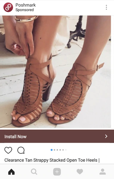 Şaşırtıcı olmayan bir şekilde, kullanıcıların uygulamanızı indirmesini sağlamaya çalışıyorsanız, uygulama yüklemeleri hedefi idealdir. Uygulama yüklemeleri amacı ile herhangi bir Instagram reklam türünü kullanabilirsiniz. İşte Poshmark'tan, kullanıcıları mobil uygulamasını indirmeleri için doğrudan ilgili uygulama mağazasına yönlendiren bir dönen reklam örneği: