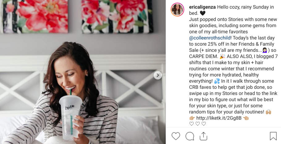 Bu nedenle, bağlı kuruluş blogu veya web sitesi olan etkileyicileri aramanızı öneririz. Bu yayıncılar muhtemelen markaları tanıtma konusunda deneyimlidir. Ayrıca, Instagram içeriğiyle eşleştirilmiş bir site, ürünlerinizin farkındalığını yaymak için birden fazla kanal anlamına gelir.