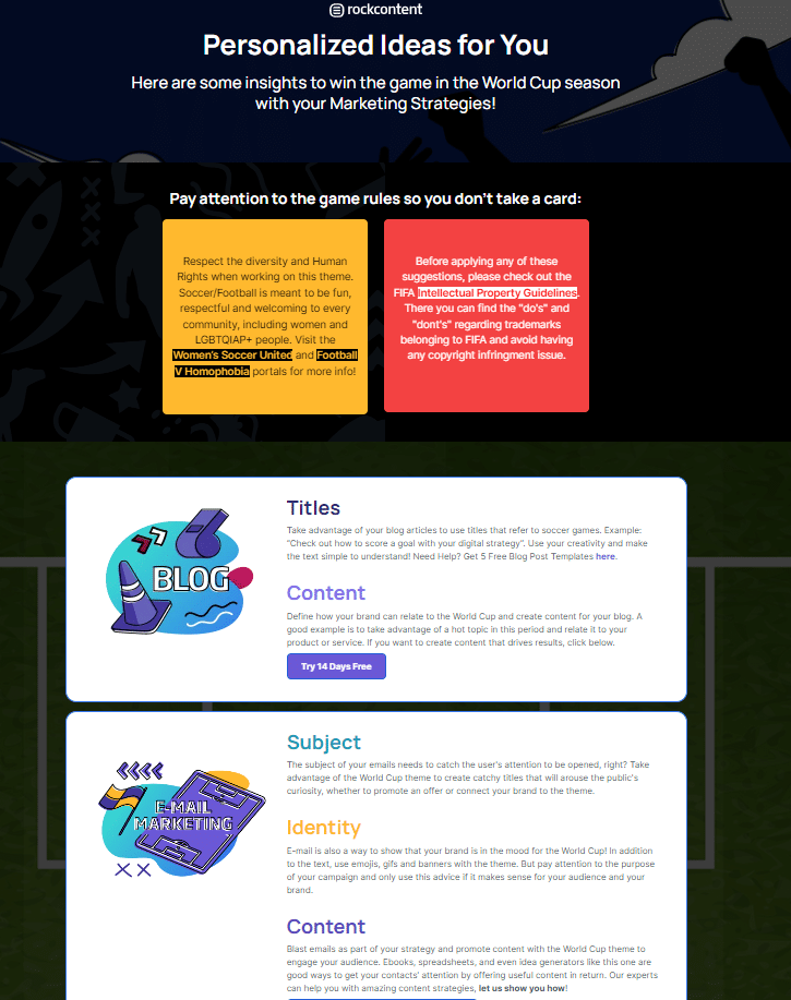 Pazarlama profesyonellerinin mevcut stratejilerine göre yeni içerik parçaları ve diğer teklifleri kullanıma sunarken ilham almalarına yardımcı olmak için bir Fikir Oluşturucu oluşturduk.