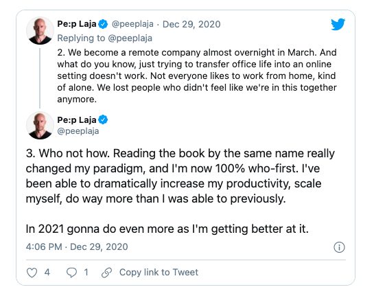 “Bunu nasıl yapabilirim?” yerine “Bunu benim için kim yapabilir?” diye sormaktan daha iyidir. Yol boyunca tükenmeden kariyerinizi ilerletmek veya işinizi büyütmek istiyorsanız, Who Not How size daha azıyla daha fazlasını yapma zihniyetini verir.