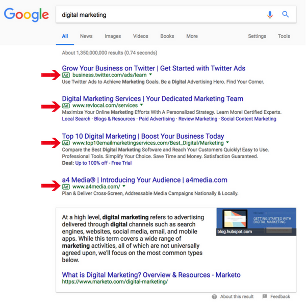 Son zamanlarda, en üstteki bir avuç arama sonucunun yanında görünen küçük “AD” kutularını fark ettiniz mi? Bunlar, reklamveren tarafından aramalarda o kadar yüksek görünmek için ödenen PPC reklamlarıdır.