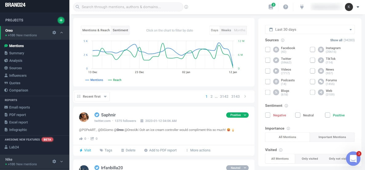 Brand24, Facebook, Instagram, Twitter, Haberler, Bloglar, Forumlar, Reddit, LinkedIn, Medium, Quora, Youtube, TikTok, Yorumlar, Twitch, Haber Bültenleri ve Podcast'lerde bahsi izleyen gelişmiş bir medya izleme aracıdır.