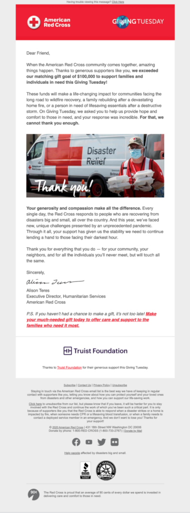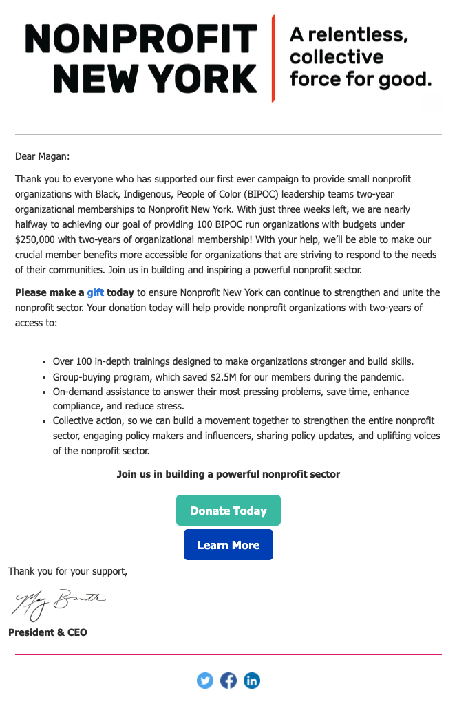 Kâr amacı gütmeyen New York, "Neredeyse yolun yarısındayız!" başlıklı bir e-posta gönderdi. hedeflerine yönelik kaydettikleri ilerlemeyi paylaşmak ve destekçileri bağışları sürdürmeye motive etmek.