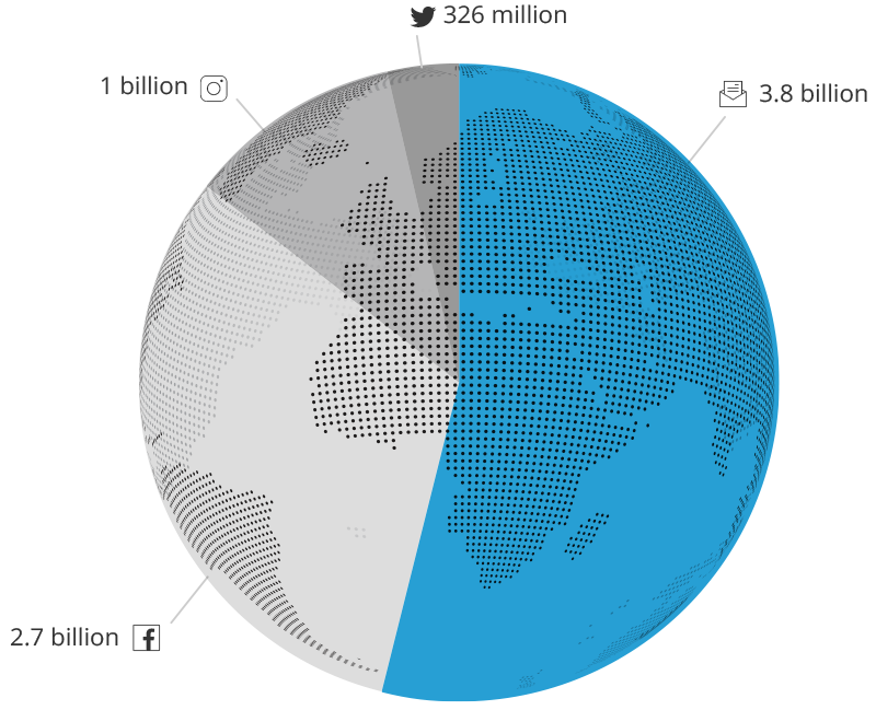 Erişim, belirli bir ortamda reklamlarınızla potansiyel olarak iletişim kurabilecek kişilerin sayısını dikkate alır. Sosyal medyaya erişim, toplam aktif kullanıcı sayısını hesaba katar. Örneğin, Facebook için dünya çapında aylık aktif kullanıcı sayısı 2,27 milyar, Twitter 326 milyon ve Instagram yaklaşık 1 milyar. Ancak, dünya çapında 3,8 milyardan fazla e-posta kullanıcısı var. Bu, dünyadaki insanların yarısından fazlasının e-posta kullandığı anlamına geliyor.