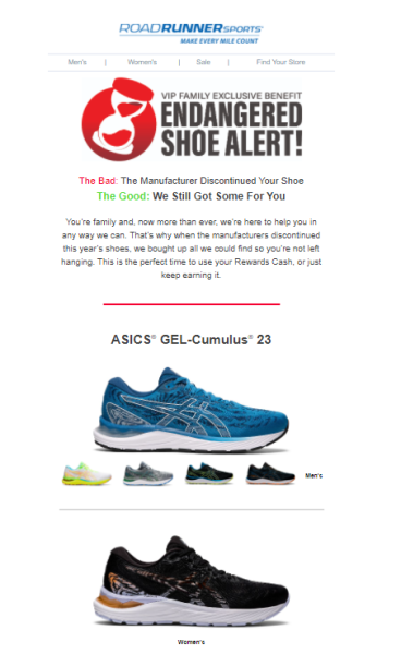 Road Runner Sports, yenilerine yer açmak için eski ürünleri boşaltmak için bir e-posta kampanyası gönderdi. Bununla birlikte, e-posta, müşterilere bu tarzların sona ermek üzere olduğunu hatırlatarak bir aciliyet duygusu yaratır.