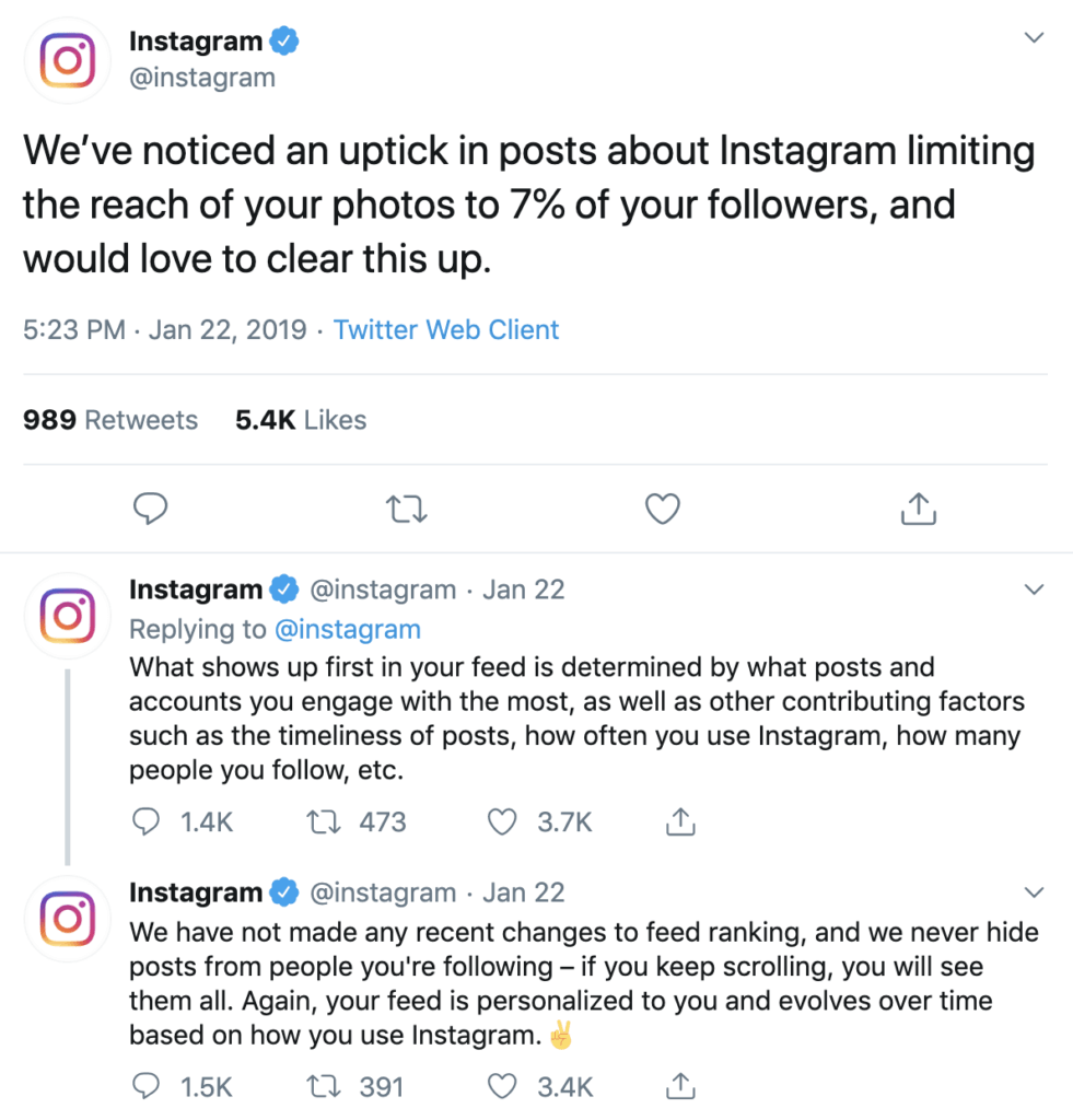 Geçen yıl algoritma değişikliği söylentilerinin ortaya çıkmasından sonra Instagram, Twitter'da bir açıklama yayınladı: