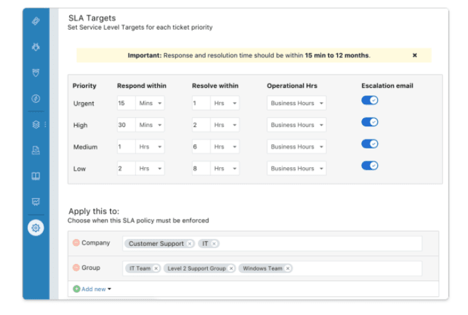 Freshworks'ün Freshservice platformu, ihtiyacınız olan tüm SLA yönetim özellikleriyle tamamlanmış, web tabanlı bir BT hizmet masası aracıdır. Bununla, SLA hedeflerinizi uygun şekilde ayarlayabilir, bir panoyu tamamen özelleştirebilir ve öncelik, yanıt süresi ve çözüm süresi için hedefler belirleyebilirsiniz.