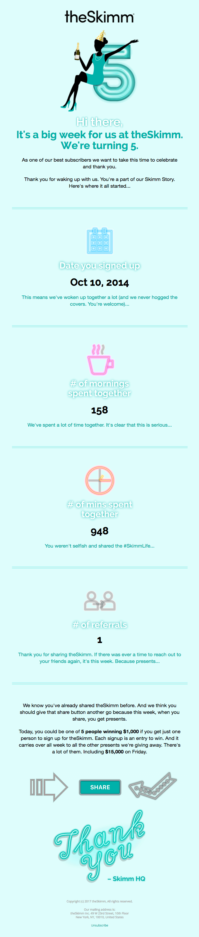 Skimm , bin yıllık kadınlara yönelik bir güncel olaylar bültenidir. 5 yıllık dönüm noktası teşekkür e-postalarını başarılı yapan şeyin ne olduğunu görün.