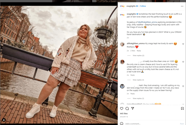 Markalar, mikro etkileyicilerin ve kullanıcı tarafından oluşturulan içeriğin kitleleri markanın kendisinden daha fazla etkileyeceğini biliyor. Bu karanlık sosyaldir çünkü başka bir kullanıcının gönderisinin altındaki yorumlar, ortak değilseniz veya etiketlenmiyorsanız kendi ölçümlerinizde gösterilmeyecektir. Ama yine de bir marka için değerlidirler. Hashtag'leri ve yorumları takip etmek, ürünlerinizi öne çıkaran gönderileri görmenizi ve kendi sayfalarınızda paylaşmanızı sağlar. Gerçek kadınların kıyafetlerini giydiklerini ve harika göründüklerini vurgulayan Snag taytlarının bu gibi özgün gönderilerine bayılıyorum!