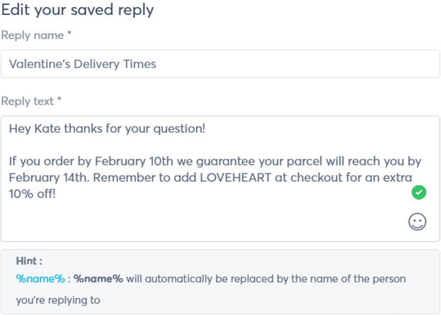 Kaydedilmiş bir yanıt, sizi her seferinde cevaba bakmaktan veya şirketinizin web sitesinden kopyalayıp yapıştırmaktan kurtarabilir. Kullanıcının adını eklemek için istediğiniz kadar yanıt oluşturabilir ve bunları düzenleyebilirsiniz.