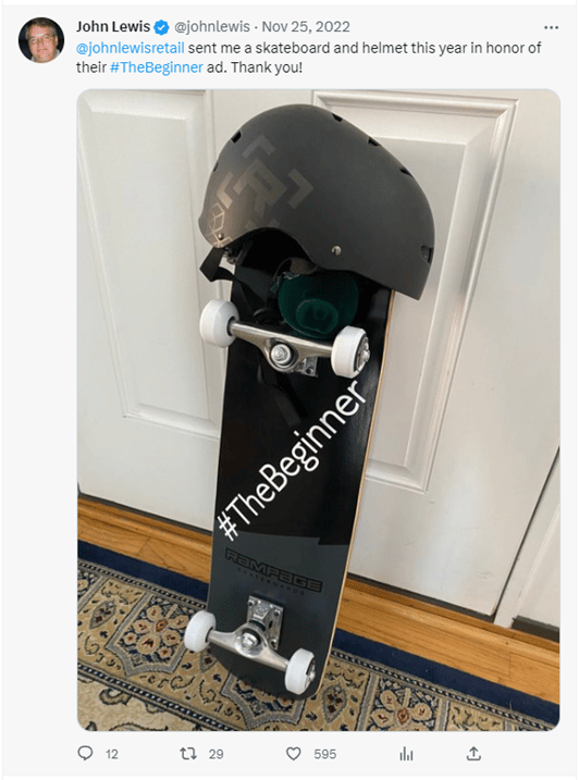 Bunun çalışan bir örneği, Birleşik Krallık'ta en iyi Noel reklamlarını sunan büyük bir mağaza olan John Lewis & Partners olabilir! John Lewis'in Twitter'da @JohnLewis tanıtıcısı yok. @JohnLewisRetail'e sahipler. Bunun yerine sap, adında hoş bir adama ait… evet tahmin ettiniz… John Lewis!