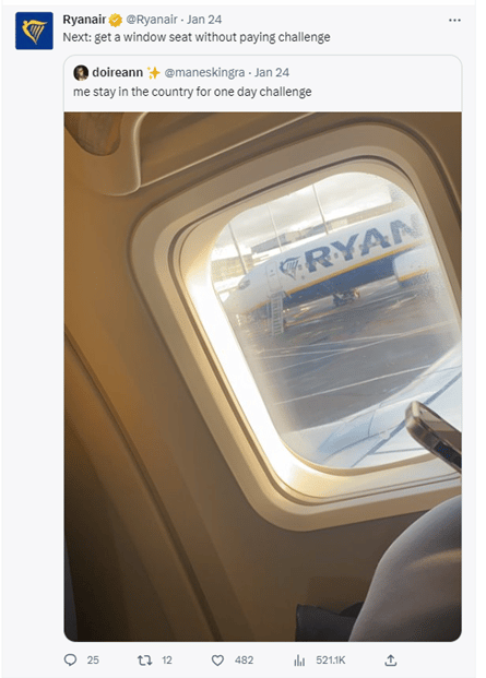 Ryanair, mem konusunda ustadır ve düzenli olarak marka sözlerini, trendleri ve hatta uçaklarının fotoğraflarını çeker ve bunları tweet'lere dönüştürür. Bu, sosyal medya ekiplerinden bazı sağlam medya izlemeleri gerektirir!