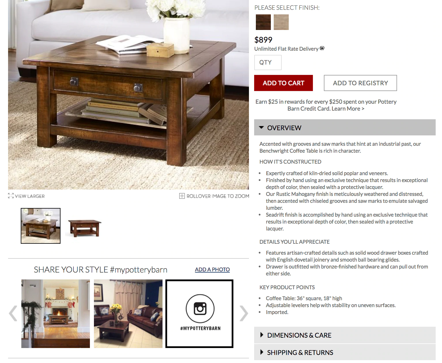 由 Pottery Barn 制作的标准产品照片是您所期望的。 “分享你的风格#mypotterybarn”部分用于用户生成的产品照片。 您可以单击它们以查看您正在考虑在真实买家家中购买的产品: