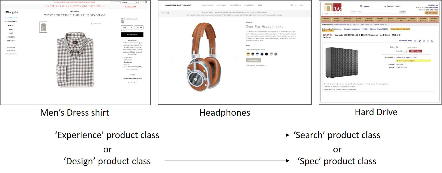 您会注意到这三个项目非常不同。 在左边,我们有一件男士正装衬衫,这是一种设计或体验产品。 在右边,我们有一个硬盘驱动器,它是一个搜索或规范产品。 耳机正好落在这个比例的中间。