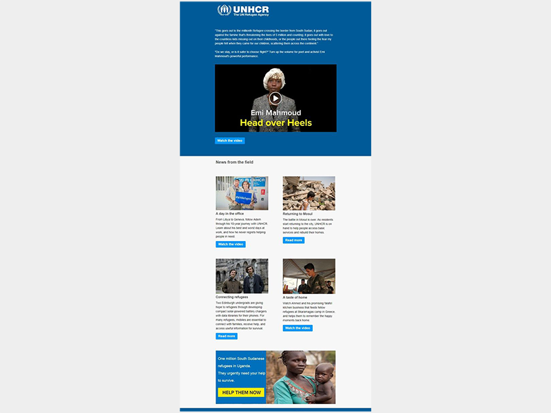 这封 UNHCR 电子邮件是良好的非营利性通讯的完美示例。 它具有视频链接、个性化的新闻故事和强大的 CTA。