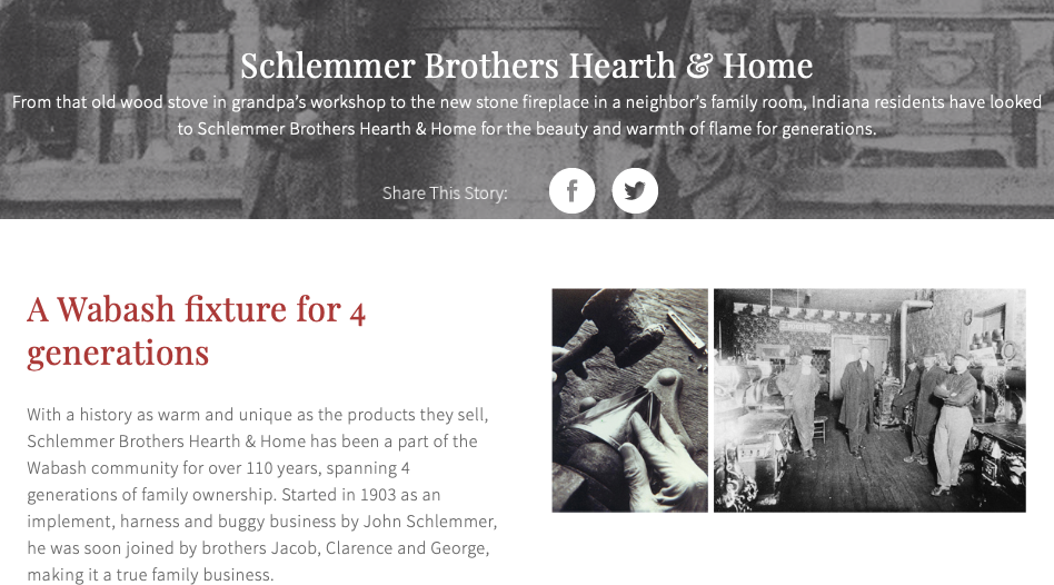 Schlemmer Brothers Hearth & Home 是一家位于印第安纳州沃巴什的家族企业。 该公司与 Wabash 的历史渊源是所有者 Kent Henderson 的骄傲,他在“关于我们”页面中强调了这一点,提到该公司已经为社区服务了 110 年。 商店的老式家庭照片在页面上进一步强调和支持了这一令人印象深刻的事实。