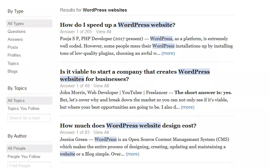 在 Quora 搜索栏中输入您的主题。 使用左侧的过滤器缩小结果范围。