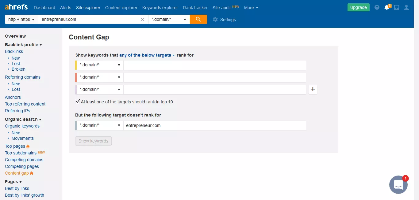 从您的评分正负 10 分的竞争对手开始。 复制靠近您的那些,然后转到站点资源管理器 > 内容差距。 在那里添加竞争 URL,该功能将找到他们排名的所有竞争对手的关键字,而您根本没有排名。