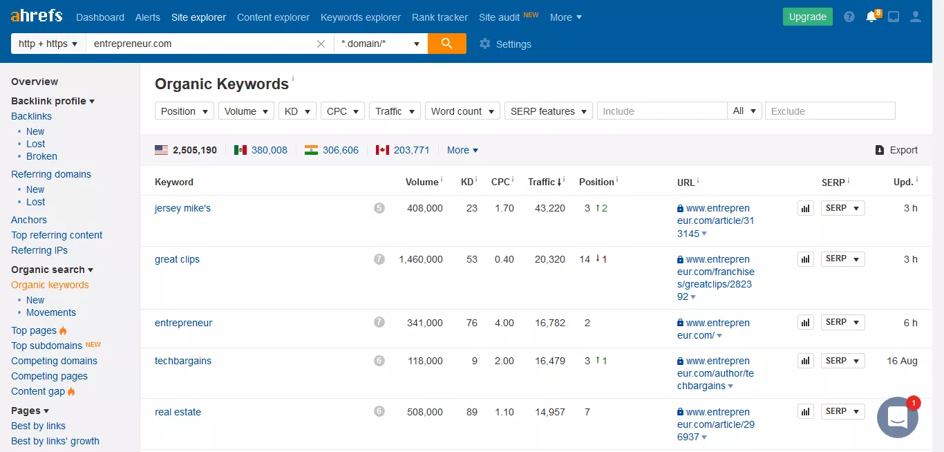 在搜索栏中输入链接,然后单击侧栏中的“有机关键字”。