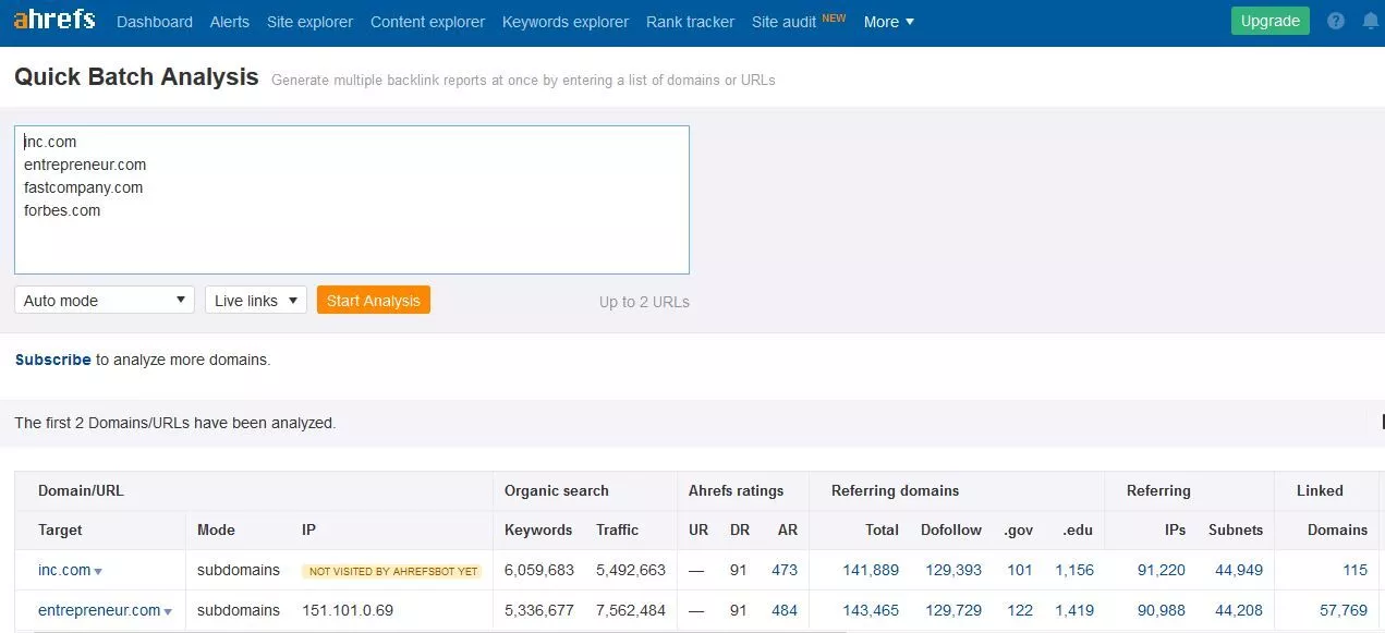 复制竞争对手列表中的所有 URL,然后返回 Ahrefs 的批处理分析工具。 粘贴 URL 并开始分析。