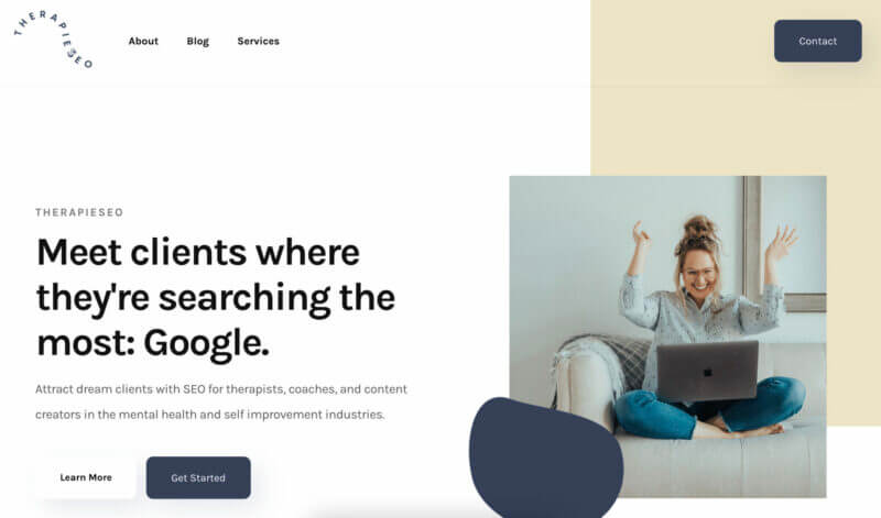 例如,我从 iPullRank 的支持 SEO 的人员列表中发现了 Kristie Plantinga。 我发现她的网站非常漂亮,并问她是如何决定专门针对治疗师进行 SEO 的:“我与治疗师合作是因为我要成为一名治疗师 [但] 反而追求了我对写作的热爱。 在与治疗师合作之前,我曾与律师合作。 [我发现有些] 律师真的很有侵略性,所以我决定找一些我知道会更友善、更有耐心的专业人士。 我最终没有直接从事心理健康工作,但现在我可以支持这样做的人,”她在 Twitter 上告诉我。 她追求自己的优势和专业领域,并为治疗界服务。