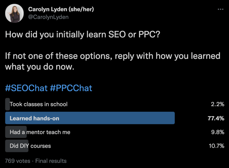 不久前,我做了一个非正式的 Twitter 民意调查,询问人们是如何学习搜索营销的。 只有 10% 的搜索营销人员有导师指导他们: