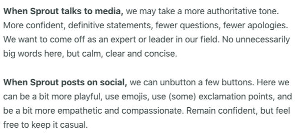 例如,在 Sprout,我们制定了自己的风格指南,以针对不同场景微调品牌声音,例如更正式的媒体声明和随意的社交反应之间的差异。
