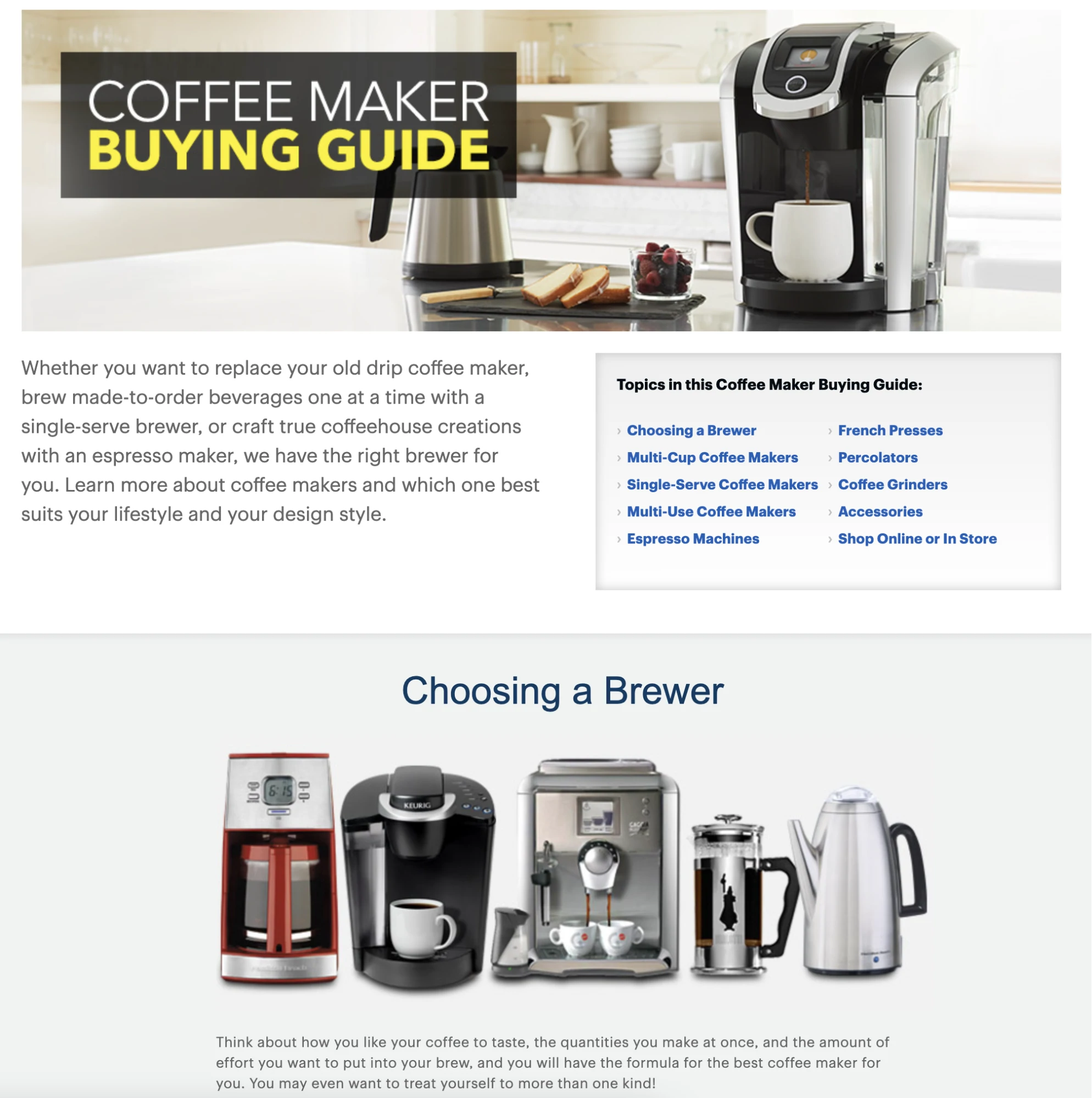 带有标题和分节符的轻段落使指南易于浏览并吸引读者的注意力。 读者还可以跳转到他们想要立即了解的特定咖啡机的信息,使读者更容易学习、决定和从页面上进行购买。