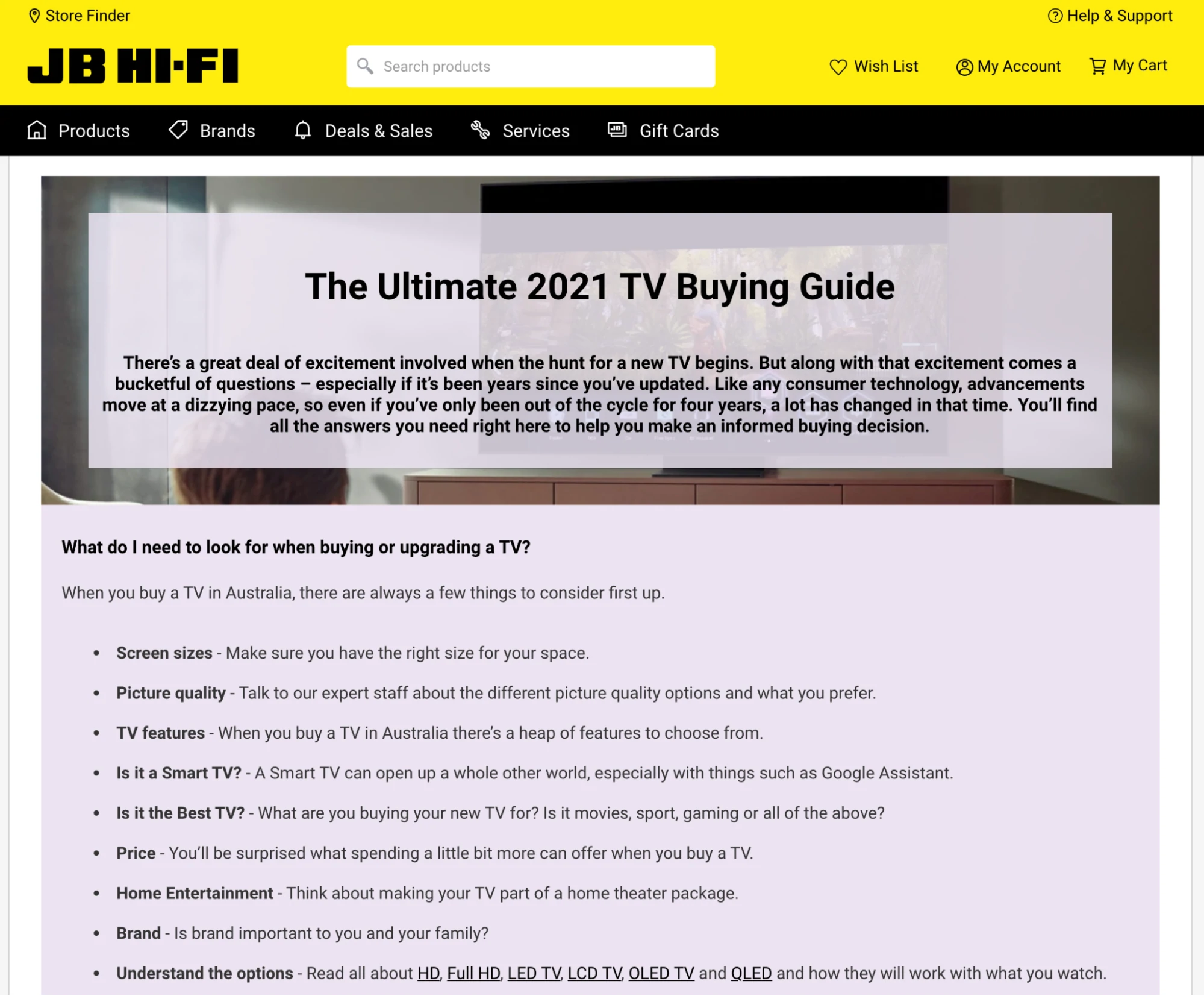 JB Hi-Fi 是澳大利亚最大的家庭娱乐零售商,销售电脑、手机、耳机、电视等。 它使用买家指南来教育潜在买家了解不同的产品并帮助他们进行购买。