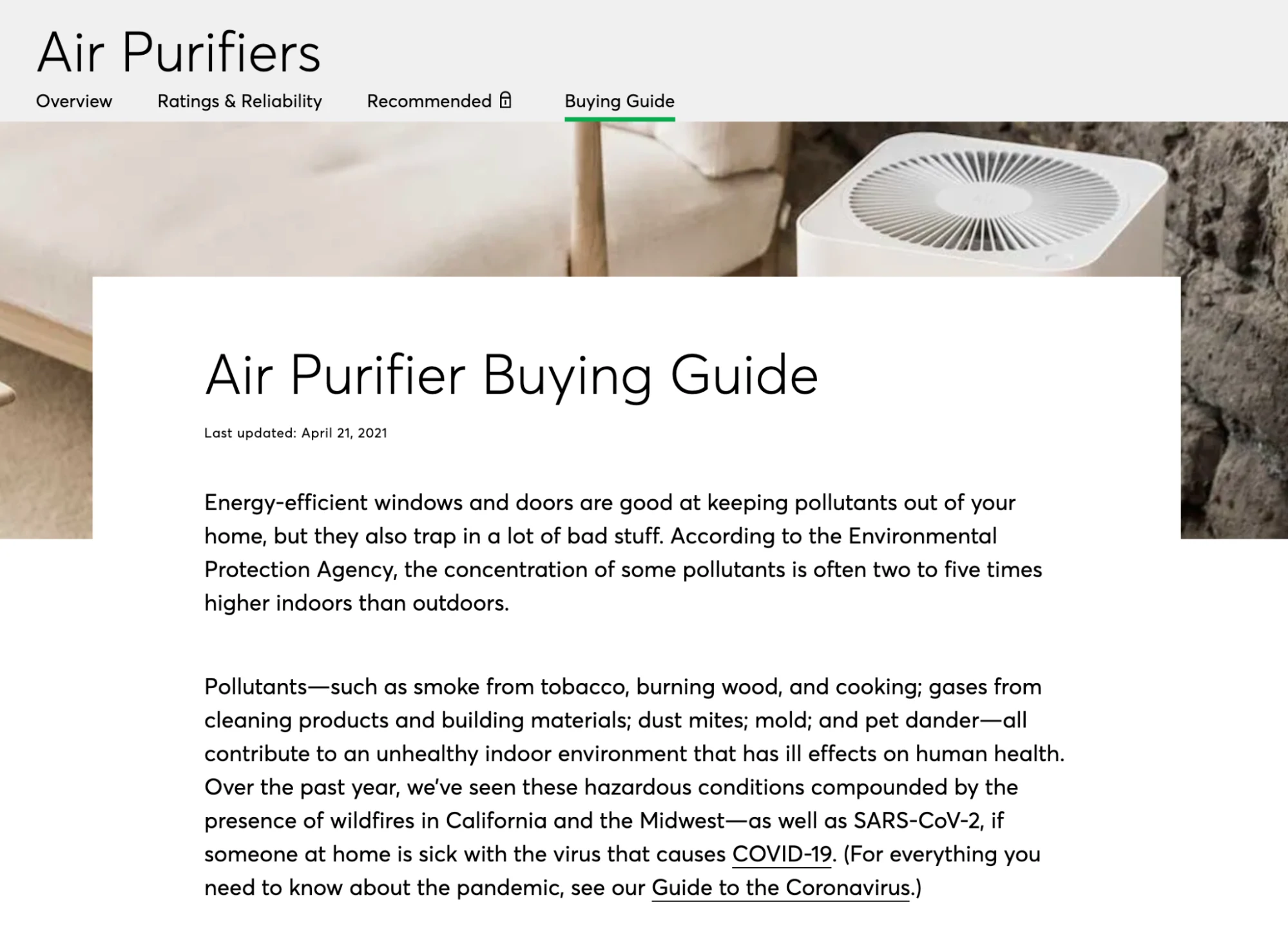 它的 空气净化器购买指南 以一个与读者相关的故事开头。 它涵盖了最近发生的事件,例如野火和 COVID-19,以及这些事件如何促使人们使用空气净化系统。 如今,谁不想要一个无污染、健康的室内环境?