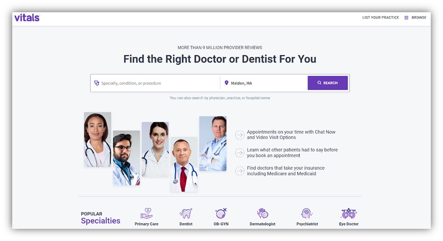 Vitals 专门为牙科、妇产科、初级保健、皮肤科、精神科医生和验光等热门诊所提供企业列表。 它为用户提供了多种方式来查找您的医疗保健业务,因为它可以按城市、条件、专业、程序或医生姓名提供建议和搜索。