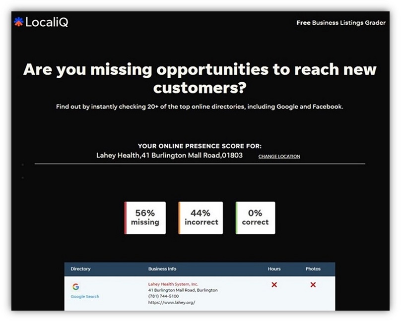 定期检查您的医生评论网站列表,避免常见的搜索引擎优化和列表错误。 首先,您可以使用在线工具(如 LocaliQ 免费商业列表分级器)快速检查所有列表。