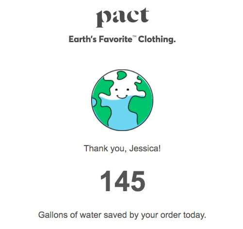 Pact 告诉您在购买他们的有机棉服装后您节省了多少加仑的水。 现在,客户会对他们的购买感觉良好——鼓励正面评价和口碑营销。