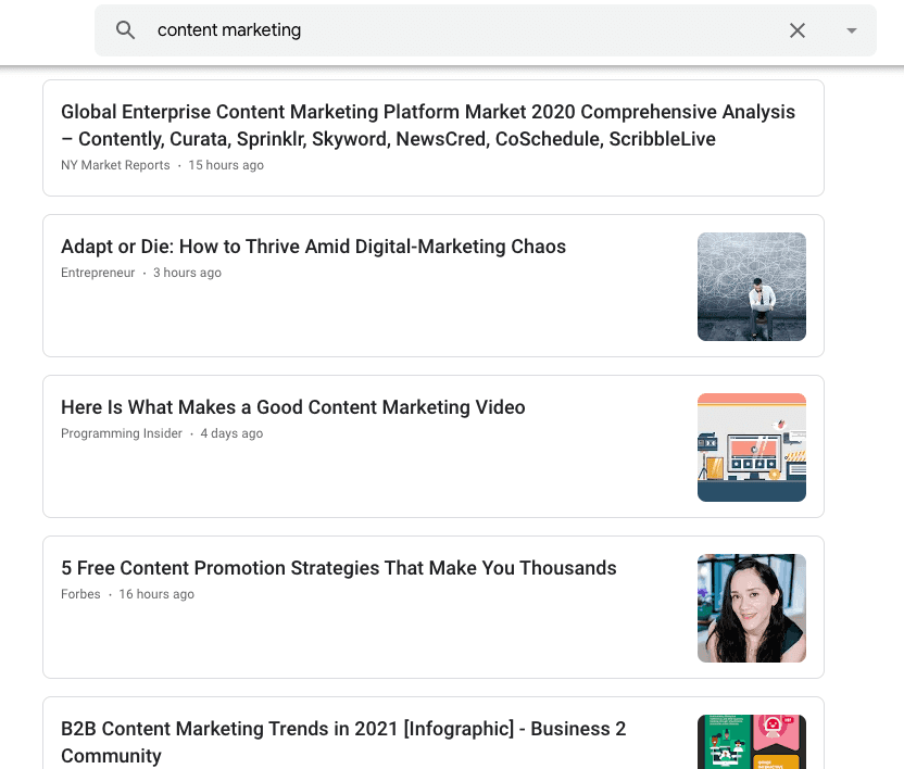 最后,杀手级头条的一个重要方面是它们很容易被浏览。 大多数情况下,您的受众会在浏览社交媒体或随意浏览网页时找到您的内容,并且他们希望在简单浏览标题后能够理解您文章的内容和角度。 这就是为什么您需要确保所有标题都包含任何考虑阅读该文章的人的重要信息,同时又要简短明了,以便他们可以在一秒钟内阅读。 为了显示可略读性在标题中的重要性,我在 Google 新闻中快速搜索了“内容营销”一词。