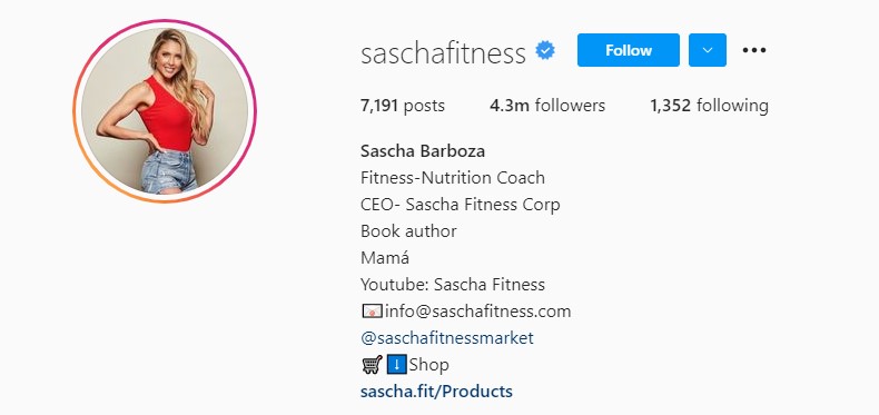 Sascha Barboza 更广为人知的是 Sascha Fitness。 她是一名获得 ISSA(国际运动科学协会)认证的私人健身教练,在西班牙健美联合会研究运动营养,并获得营养健身硕士学位。