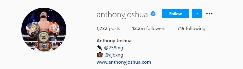 约书亚在 2012 年奥运会上获得金牌,然后在 2013 年转为职业选手。他是第二位在奥运会上同时获得金牌和主要职业制裁机构世界冠军的英国拳击手(也是第一位英国重量级拳手)。