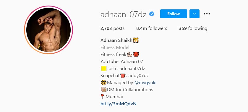 Adnaan Shaikh 在他的 Instagram 页面上将自己描述为健身模特和健身狂人。 总部位于孟买的 Shaikh 在 Instagram 上拥有 840 万粉丝。 尽管他在 YouTube 上的订阅者较少,只有 30 万,但它确实允许他分享视频,例如我如何在斋月期间保持健康和锁定期间的全身锻炼技巧。
