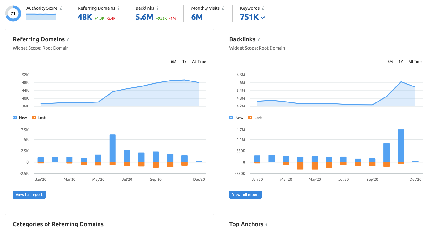 SEM Rush 的反向链接分析和链接构建工具可让您深入了解反向链接配置文件。 免费版在链接构建工具中将您限制为 100 个域,但您将能够识别您的引用域和反向链接,包括收益和损失,以及您的反向链接权限分数。 该工具可帮助您确定可以改进链接构建工作的区域,或者您可以在线获得更多可见性的区域。