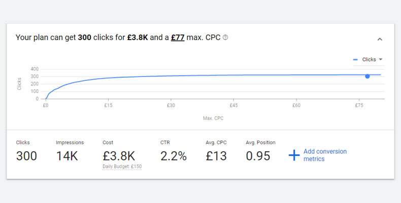 获得每月搜索总数的关键是将最高 CPC 值提高到它允许的最高值。 这将预测所有展示次数,就好像您的广告位居第一且位于第一页的最顶部。 请务必检查您是否在精确匹配设置中使用它,而不是偶然地进行广泛匹配,因为数量估计可能相差甚远!