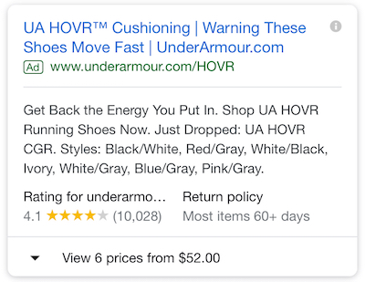 在 Under Armour 的这个广告中,评级、评论数量和唯一合格(60 天以上退货政策)都在移动搜索中突出显示: